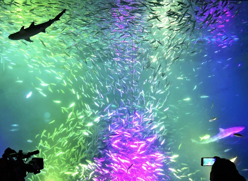 The sardines, caught in the Seto Inland Sea, will be guided by fishing lights and food during the show. Visitors will be able to see their sudden movements as the fish react to rays and sharks swimming in the same tank.