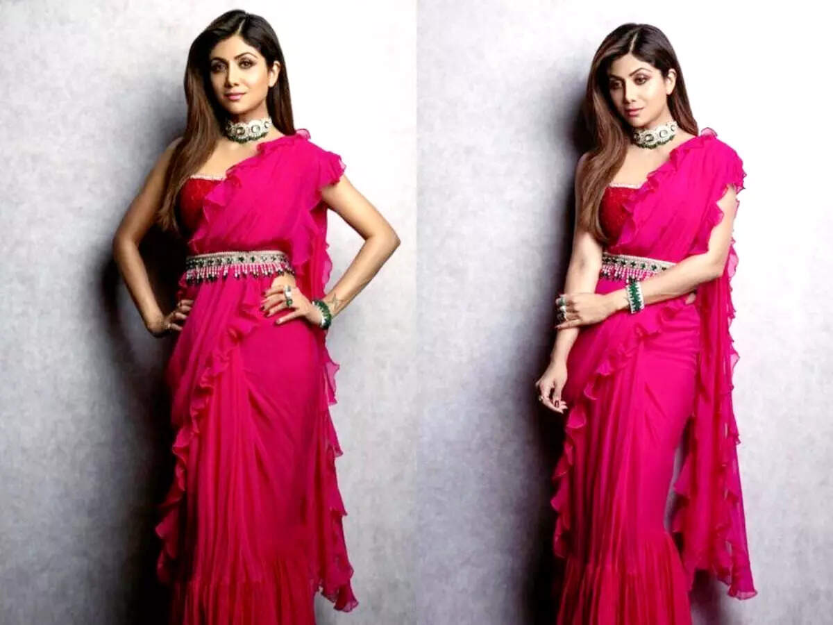 Drape saris in satin or Banarasi fabrics with ruffles and sharp cut blouses are in demand and can be seen rising in the year 2022. Playful sleeves and big layered ruffles with belts and embroidery make a likeable choice for many occasions for the bride and the bridesmaids as well.