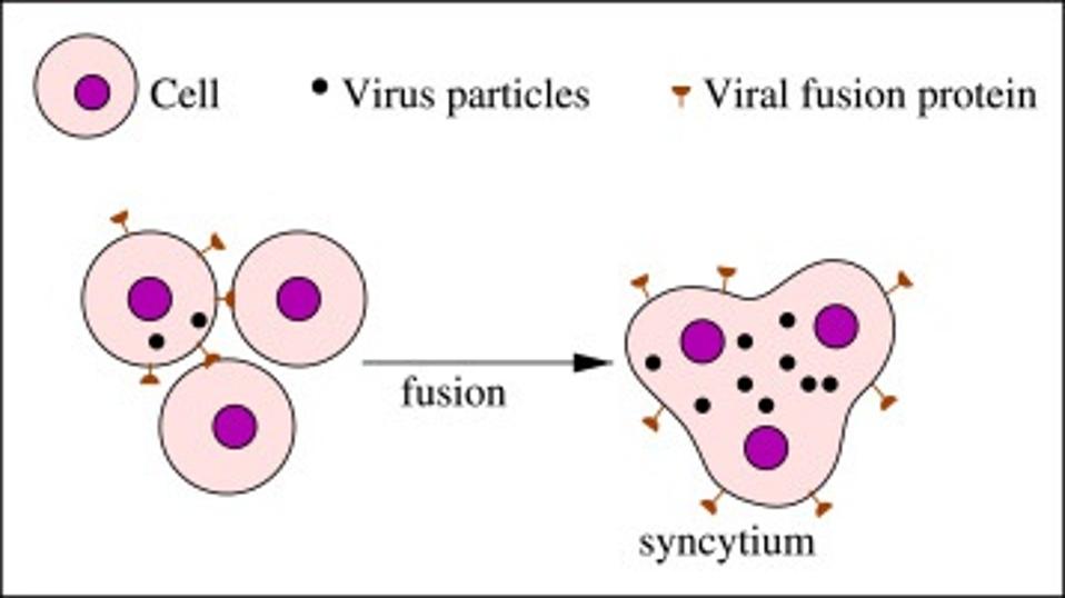 Although the impacts of SARS-CoV-2 infection have been recorded across the board —from the liver to the heart to the brain, and beyond— nowhere is the damage quite as intense as in the lungs. The presence of syncytia, along with alveolar destruction and massive blood clotting, are all characteristic of severe Covid-19. Syncytia are large, cell-like structures that form when two or more cells join together; essentially, an amorphous mass of cytoplasm and nuclei (Figure 1). Even though syncytia are crucial to the formation of our muscle tissue, when induced in response to viral infection they are pathological. Importantly, the syncytia formed in response to SARS-CoV-2 infection do not seem to heal or regenerate with time, as they do in response to the flu.