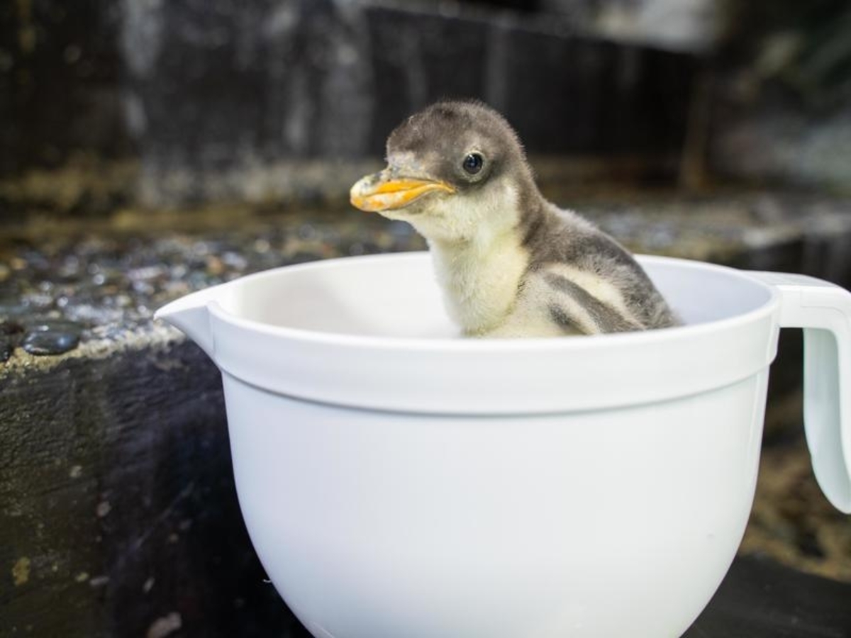 The youngster, who keepers have named Charlie, was born to the family of gentoo penguins at Sydney's Sea Life Aquarium last month, weighing just 90 grams.