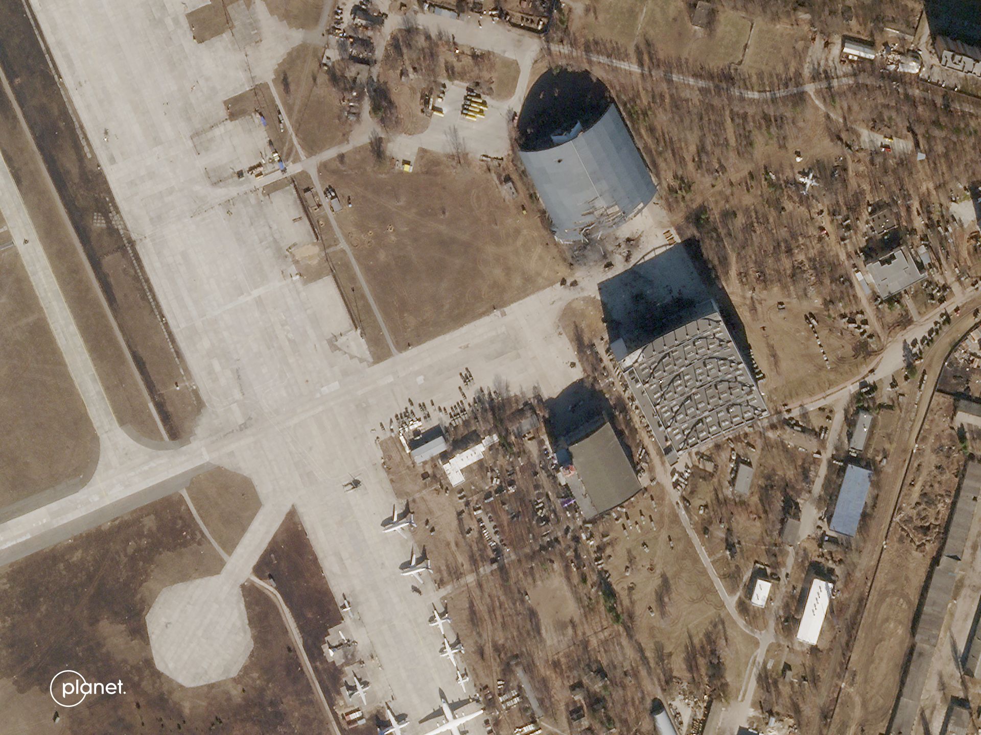 However, on February 28, damage can be seen to the airport, with what appears to be the aircraft’s tail protruding from the grey hanger.