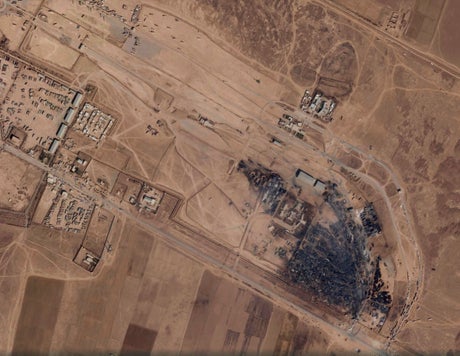 The satellite images show a mass of burned trucks, the ground around them singed black. The fire burned through an area just under a half a square kilometer (a fifth of a square mile). More trucks had lined up after the fire and other cars and people appeared to be gathered at the site Tuesday.