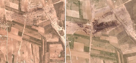 Satellite images by Planet Labs Inc. analyzed by The Associated Press on Sunday showed a fire that tore through an area near Jarablus between Friday and Saturday morning.