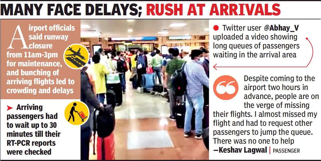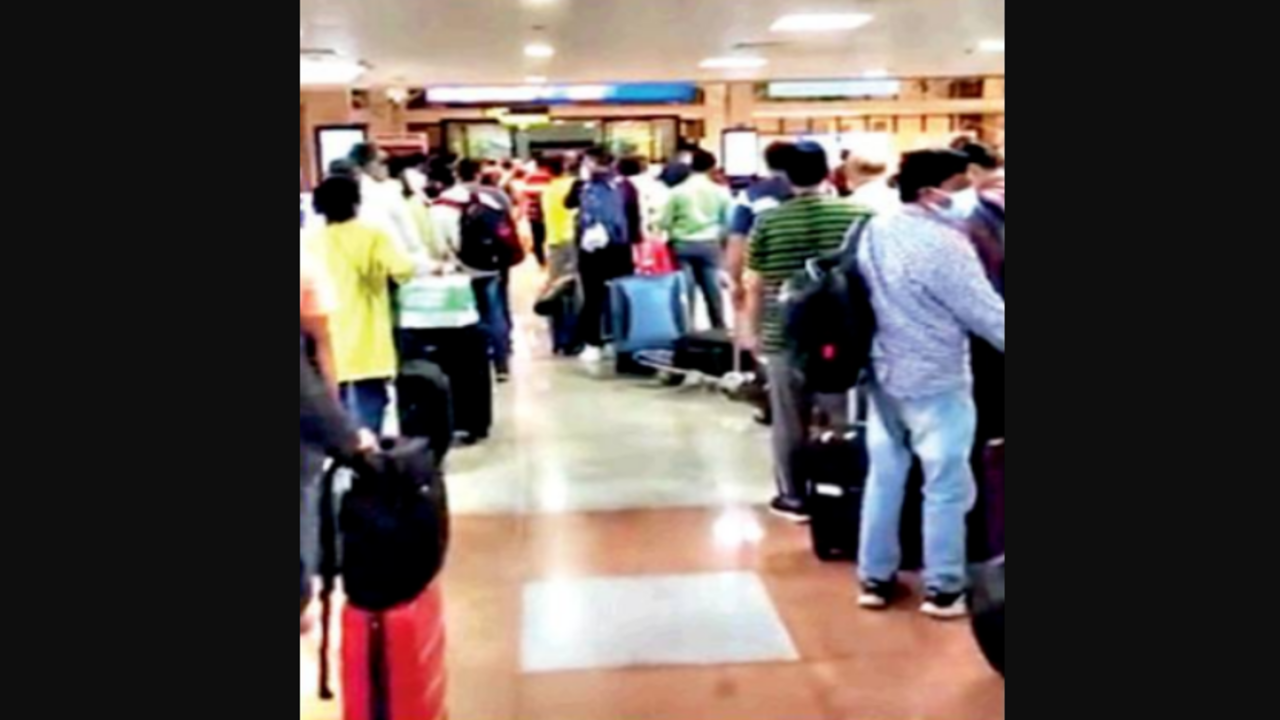 Uploading a video on social media of a long queue at the arrival bay, a passenger wrote that it was people waiting to show RT-PCR reports. “The waiting time was 20-30 minutes with just two staffers checking certificates. There was also little regard for social distancing,” he said.