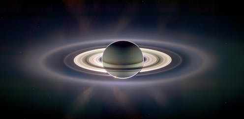 The rings are visible to anyone with a decent pair of binoculars or a modest back garden telescope. Cast white against the pale yellow orb of Saturn, the rings are composed almost entirely of billions of particles of water ice, which shine by scattering sunlight.