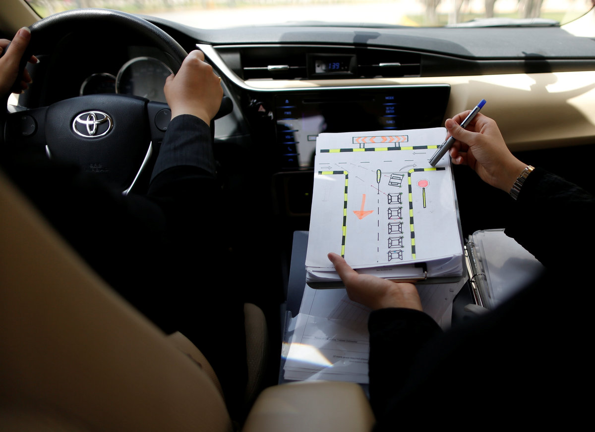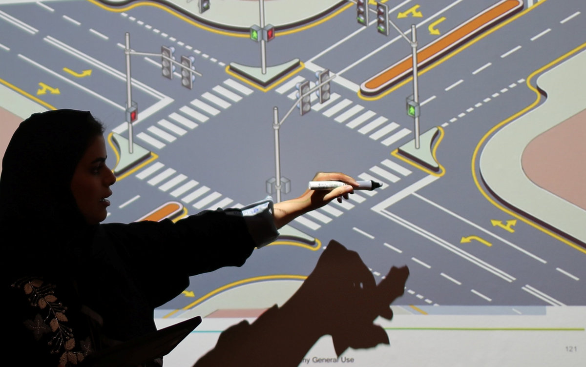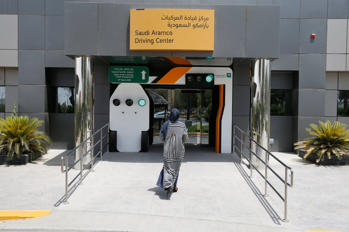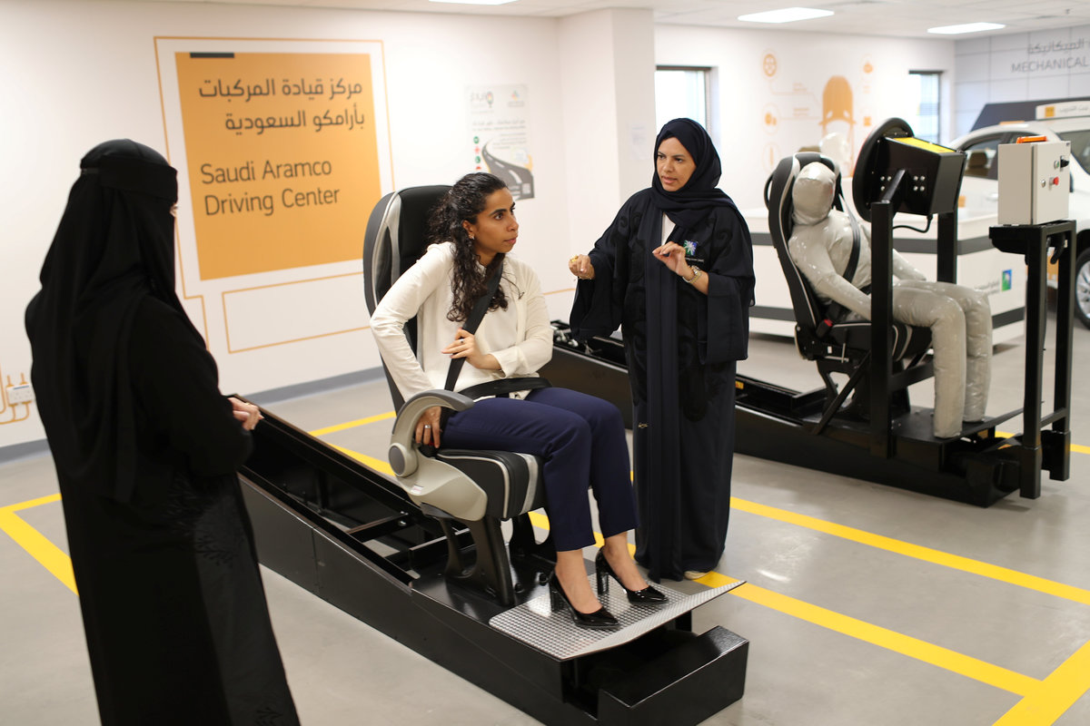 Trainee Amira Abdelgader gets into a car for her driving lesson at Saudi Aramco Driving Center in Dhahran, Saudi Arabia, June 6, 2018. REUTERS/Ahmed JadallahA driving instructor (R) explains seat bells to trainees Amira Abdulgader and Maria Al-Faraj (C) at Saudi Aramco Driving Center in Dhahran, Saudi Arabia, June 6, 2018. REUTERS/Ahmed Jadallah A driving instructor teaches trainee Maria al-Faraj (R) during a driving lesson at Saudi Aramco Driving Center in Dhahran, Saudi Arabia, June 6, 2018. REUTERS/Ahmed Jadallah Trainees Maria al-Faraj (C) and Amira Abdelgader check oil level in the engine with their driving instructor (R) during a lesson at Saudi Aramco Driving Center in Dhahran, Saudi Arabia, June 6, 2018. REUTERS/Ahmed Jadallah Trainees attend a lesson at Saudi Aramco Driving Center in Dhahran, Saudi Arabia, June 6, 2018. REUTERS/Ahmed Jadallah An illustration is seen on a wall at Saudi Aramco Driving Center in Dhahran, Saudi Arabia, June 6, 2018. REUTERS/Ahmed Jadallah A driving instructor (back) teaches trainee Maria al-Faraj during a driving lesson on a 3D screen at Saudi Aramco Driving Center in Dhahran, Saudi Arabia, June 6, 2018. REUTERS/Ahmed Jadallah Trainee Amira Abdulgader practices on a simulator car at Saudi Aramco Driving Center in Dhahran, Saudi Arabia June 6, 2018. REUTERS/Ahmed Jadallah Driving instructor Ahlam al-Somali arrives at Saudi Aramco Driving Center in Dhahran, Saudi Arabia, June 6, 2018. REUTERS/Ahmed Jadallah A driving instructor arrives at Saudi Aramco Driving Center in Dhahran, Saudi Arabia, June 6, 2018. REUTERS/Ahmed Jadallah A driving instructor teaches road signs at Saudi Aramco Driving Center in Dhahran, Saudi Arabia, June 6, 2018. REUTERS/Ahmed Jadallah A car for training stands at Saudi Aramco Driving Center in Dhahran, Saudi Arabia, June 6, 2018. REUTERS/Ahmed Jadallah Trainee Maria al-Faraj stops the car at a stop sign during a driving lesson with her instructor at Saudi Aramco Driving Center in Dhahran, Saudi Arabia, June 6, 2018. REUTERS/Ahmed Jadallah A driving instructor teaches road signs to trainee Amira Abdulgader during a driving lesson at Saudi Aramco Driving Center in Dhahran, Saudi Arabia, June 6, 2018. REUTERS/Ahmed Jadallah