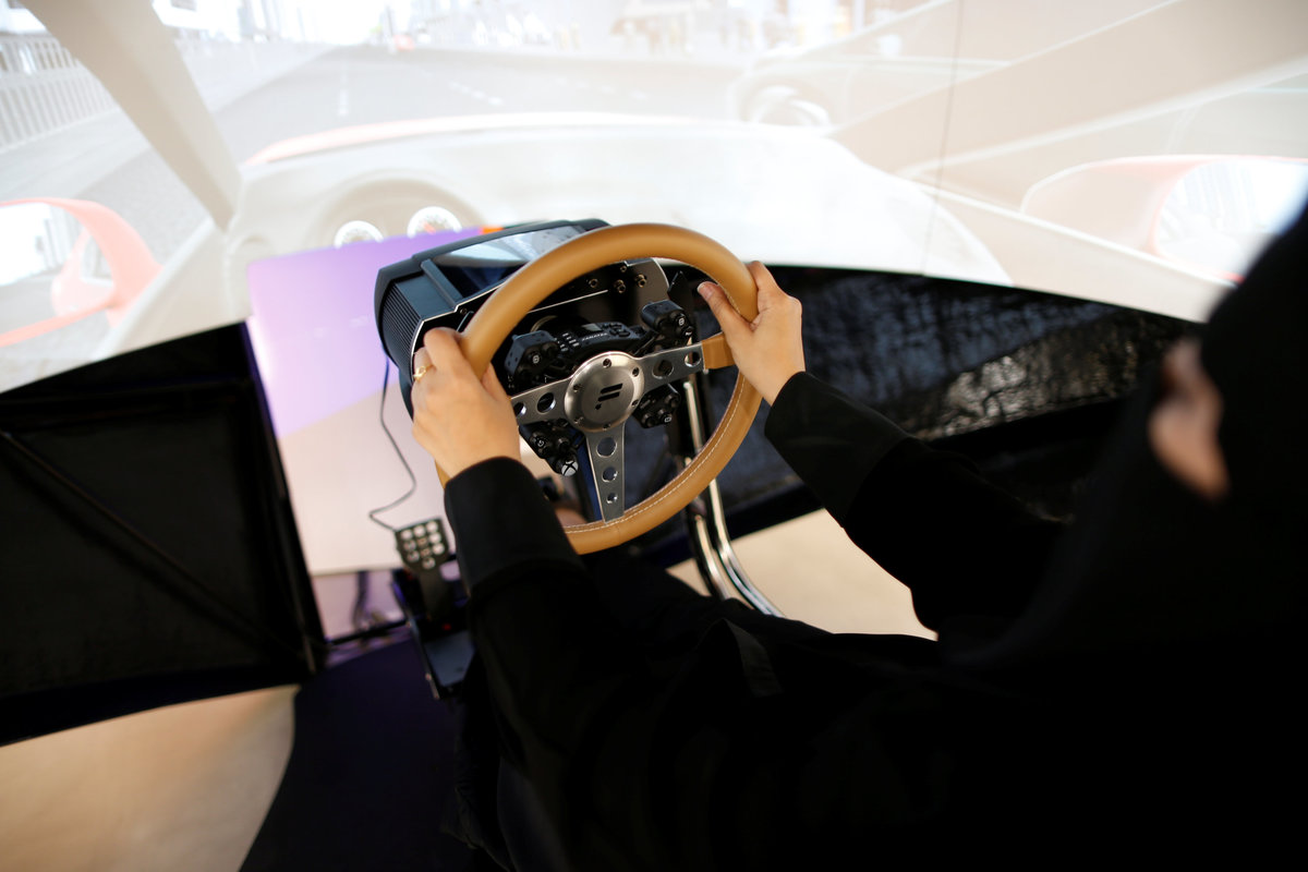 Trainee Amira Abdulgader practices with a screen in front of her during a driving lesson at Saudi Aramco Driving Center in Dhahran, Saudi Arabia, June 6, 2018. REUTERS/Ahmed Jadallah