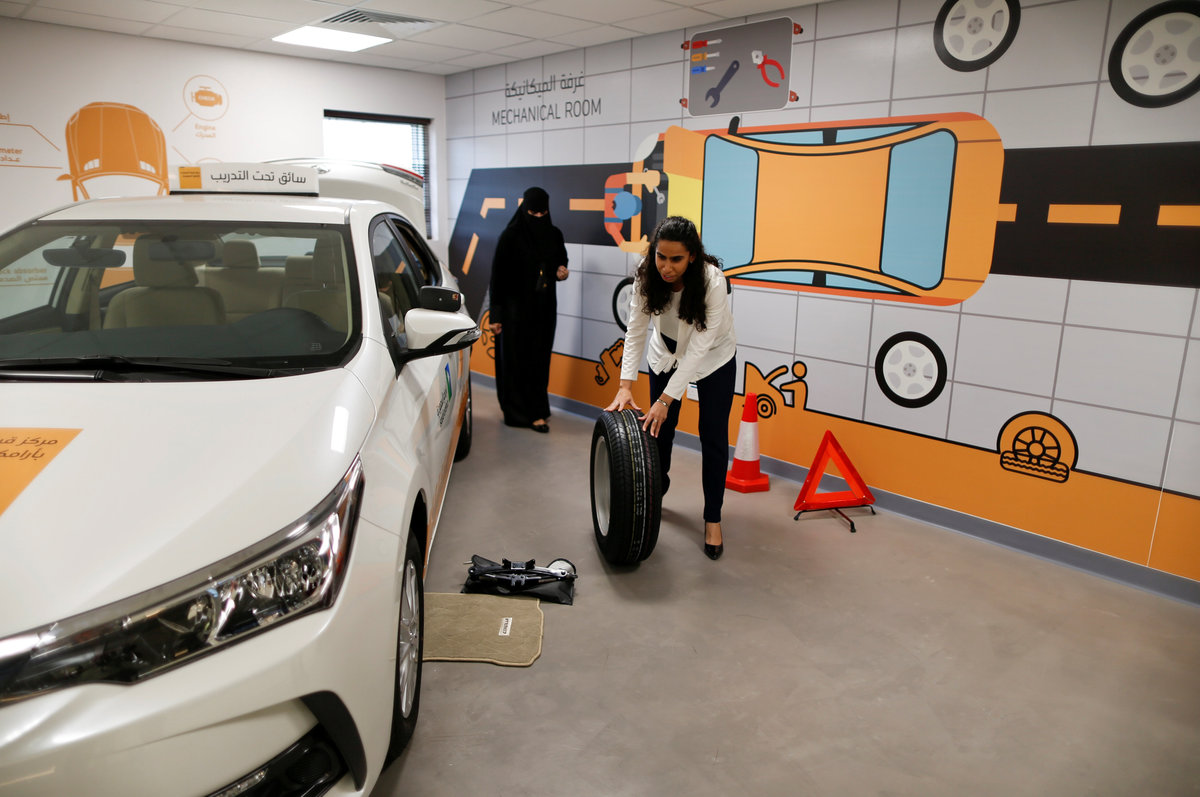 Trainee Maria al-Faraj practices how to adjust a tire during a driving lesson at Saudi Aramco Driving Center in Dhahran, Saudi Arabia, June 6, 2018. REUTERS/Ahmed Jadallah