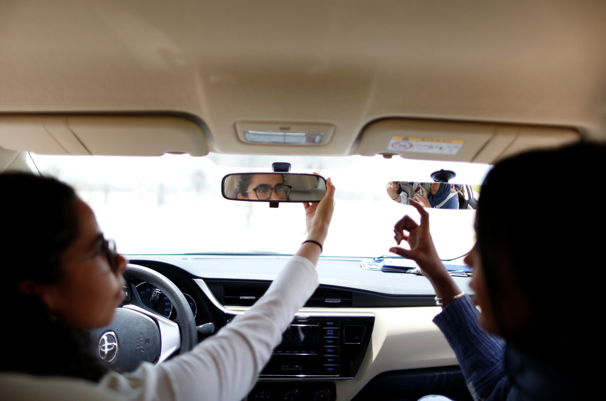Trainee Maria al-Faraj (L) adjusts a mirror during a driving lesson with instructor Ahlam al-Somali at Saudi Aramco Driving Center in Dhahran, Saudi Arabia, June 6, 2018. REUTERS/Ahmed Jadallah