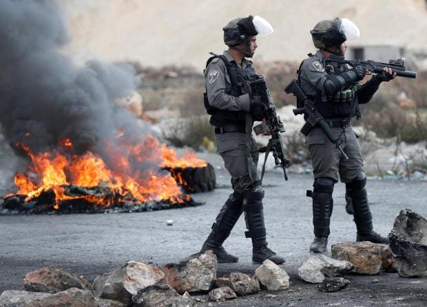 Throughout the West Bank and Gaza, Palestinians threw rocks and petrol bombs at Israeli troops. Soldiers responded with teargas and rubber bullets.