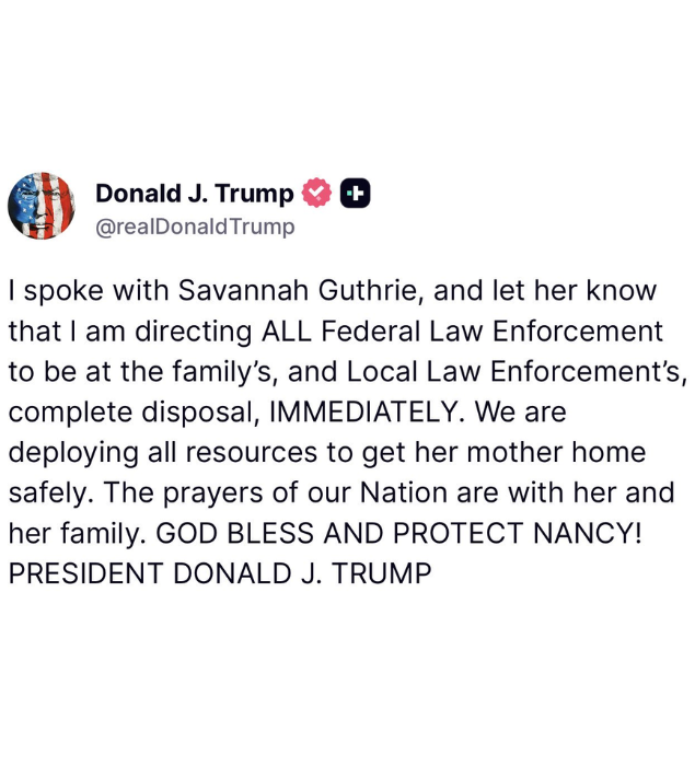 “I spoke with Savannah Guthrie, and let her know that I am directing ALL Federal Law Enforcement to be at the family's, and Local Law Enforcement's, complete disposal, IMMEDIATELY. We are deploying all resources to get her mother home safely. The prayers of our Nation are with her and her family. GOD BLESS AND PROTECT NANCY!” said Trump in a post on Truth Social.