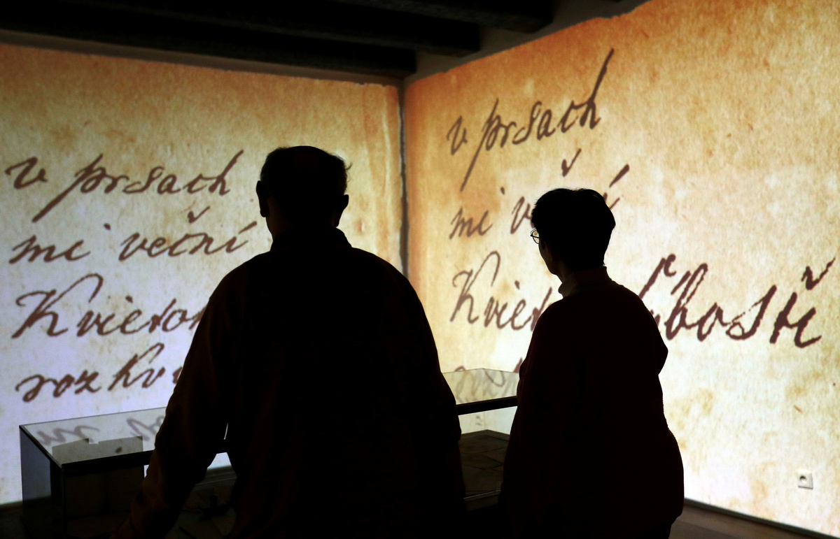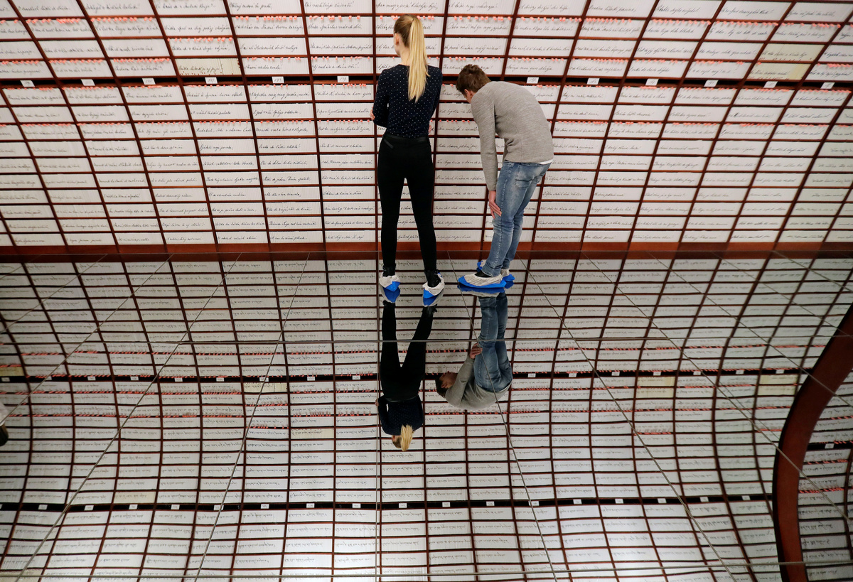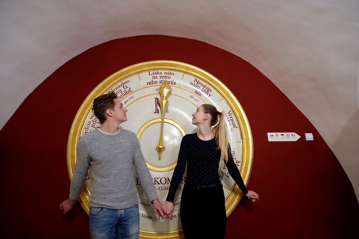 A couple kisses as they visit the Love Bank, an exhibition dedicated to the world's longest love poem "Marina" by Andrej Sladkovic, in Banska Stiavnica, Slovakia February 12, 2020. REUTERS/David W CernyA couple uses a "love-o-meter" as they visit the Love Bank, an exhibition dedicated to the world's longest love poem "Marina" by Andrej Sladkovic, in Banska Stiavnica, Slovakia February 12, 2020. REUTERS/David W CernyA couple looks at verses projected on a wall as they visits the Love Bank, an exhibition dedicated to the world's longest love poem "Marina" by Andrej Sladkovic, in Banska Stiavnica, Slovakia February 12, 2020. REUTERS/David W CernyCouples are reflected in a mirror as they visit the Love Bank, an exhibition dedicated to the world's longest love poem "Marina" by Andrej Sladkovic, in Banska Stiavnica, Slovakia February 12, 2020. REUTERS/David W CernyLove deposit boxes are seen in the Love Bank, an exhibition dedicated to the world's longest love poem "Marina" by Andrej Sladkovic, in Banska Stiavnica, Slovakia February 12, 2020. REUTERS/David W CernyA couple looks at manuscripts as they visit the Love Bank, an exhibition dedicated to the world's longest love poem "Marina" by Andrej Sladkovic, in Banska Stiavnica, Slovakia February 12, 2020. REUTERS/David W Cerny