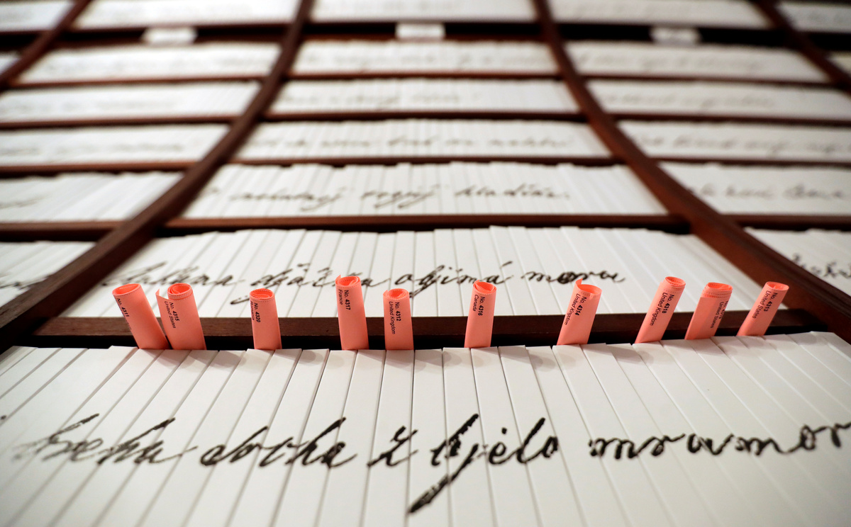 A staff member points at a plastic heart with a message in the Love Bank, an exhibition dedicated to the world's longest love poem "Marina" by Andrej Sladkovic, in Banska Stiavnica, Slovakia February 12, 2020. REUTERS/David W Cerny