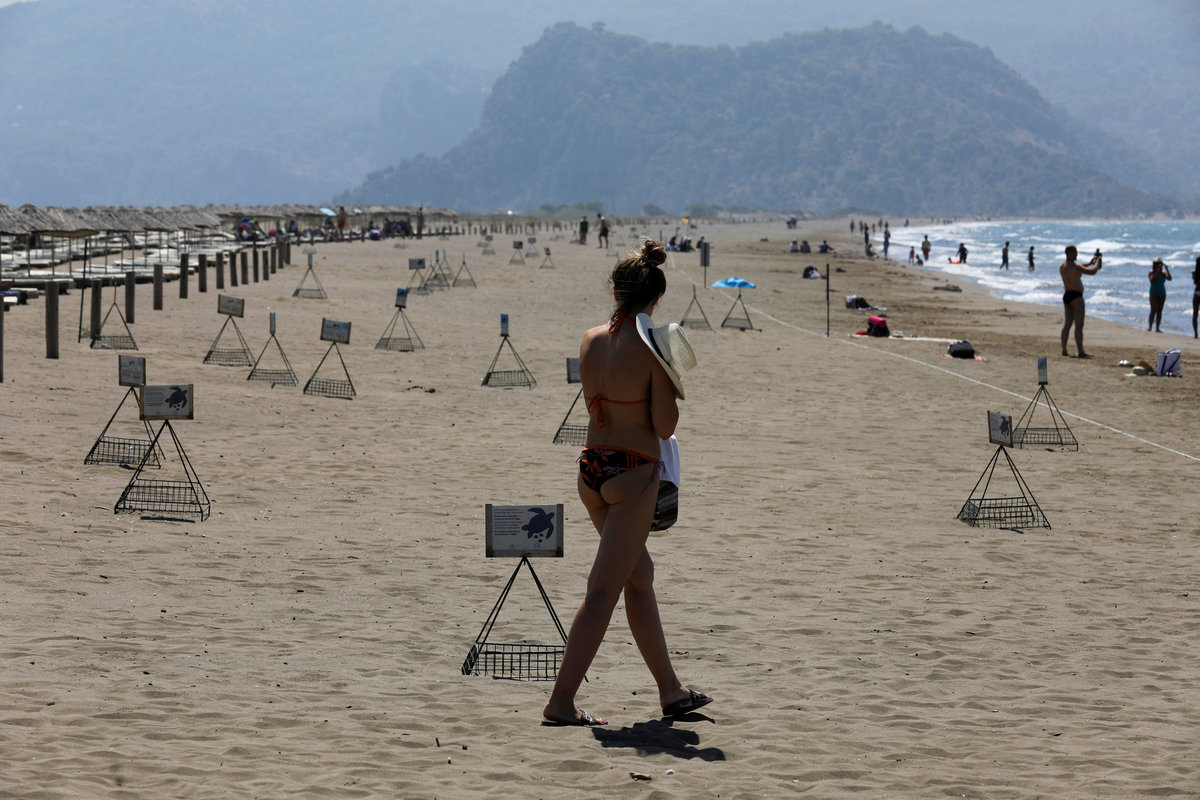 Sea Turtle Rescue Center (DEKAMER) officials inject beeswax into the shell of a sea turtle which was injured by a boat propeller, at their center at Iztuzu Beach near Dalyan in Mugla province, Turkey, July 18, 2018. REUTERS/Umit Bektas A tourist walks past sea turtle nests marked for protection at Iztuzu Beach near Dalyan in Mugla province, Turkey, July 18, 2018. REUTERS/Umit Bektas A sea turtle lays her eggs at Iztuzu Beach near Dalyan in Mugla province, Turkey, July 4, 2018. REUTERS/Umit Bektas Baby sea turtles crawl to the sea at Iztuzu Beach near Dalyan in Mugla province, Turkey, July 17, 2018. REUTERS/Umit Bektas Professor Yakup Kaska puts a sea turtle back into her open-sea cage after a medical check at the Sea Turtle Rescue Center (DEKAMER) off the shore of Iztuzu Beach near Dalyan in Mugla province, Turkey, August 25, 2018. REUTERS/Umit Bektas Sea turtle eggs which will be transferred to a safer part of the beach are seen in a basket at Iztuzu Beach near Dalyan in Mugla province, Turkey, July 4, 2018. REUTERS/Umit Bektas Sea turtle eggs which will be transferred to a safer part of the beach are seen in an open nest at Iztuzu Beach near Dalyan in Mugla province, Turkey, July 4, 2018. REUTERS/Umit Bektas A sea turtle returns to the sea after laying eggs at Iztuzu Beach near Dalyan in Mugla province, Turkey, July 4, 2018. REUTERS/Umit Bektas A baby sea turtle crawls to the sea at Iztuzu Beach near Dalyan in Mugla province, Turkey, July 17, 2018. REUTERS/Umit Bektas Sea turtle eggs are counted by volunteers from the Sea Turtle Rescue Center (DEKAMER) at Iztuzu Beach near Dalyan in Mugla province, Turkey, July 5, 2018. REUTERS/Umit Bektas A man walks on a fishgarth on the Dalyan River near Dalyan in Mugla province, Turkey, July 4, 2018. REUTERS/Umit Bektas A sea turtle under treatment swims in a tank at the Sea Turtle Rescue Center (DEKAMER) at Iztuzu Beach near Dalyan in Mugla province, Turkey, July 5, 2018. REUTERS/Umit Bektas A sea turtle under treatment is given an injection by Sea Turtle Rescue Center (DEKAMER) officials at the centre at Iztuzu Beach near Dalyan in Mugla province, Turkey, July 4, 2018. REUTERS/Umit Bektas A sea turtle returns to the sea after laying eggs at Iztuzu Beach near Dalyan in Mugla province, Turkey, July 4, 2018. REUTERS/Umit Bektas A sea turtle swims in the Dalyan river near Dalyan in Mugla province, Turkey, August 2, 2018. REUTERS/Umit Bektas A sea turtle swims back to the sea following her release after treatment at the Sea Turtle Rescue Center (DEKAMER) as tourists look on at Iztuzu Beach near Dalyan in Mugla province, Turkey, August 25, 2018. REUTERS/Umit Bektas Local cruise boats carry tourists on the Dalyan river from Iztuzu Beach to Dalyan in Mugla province, Turkey, July 6, 2018. REUTERS/Umit Bektas