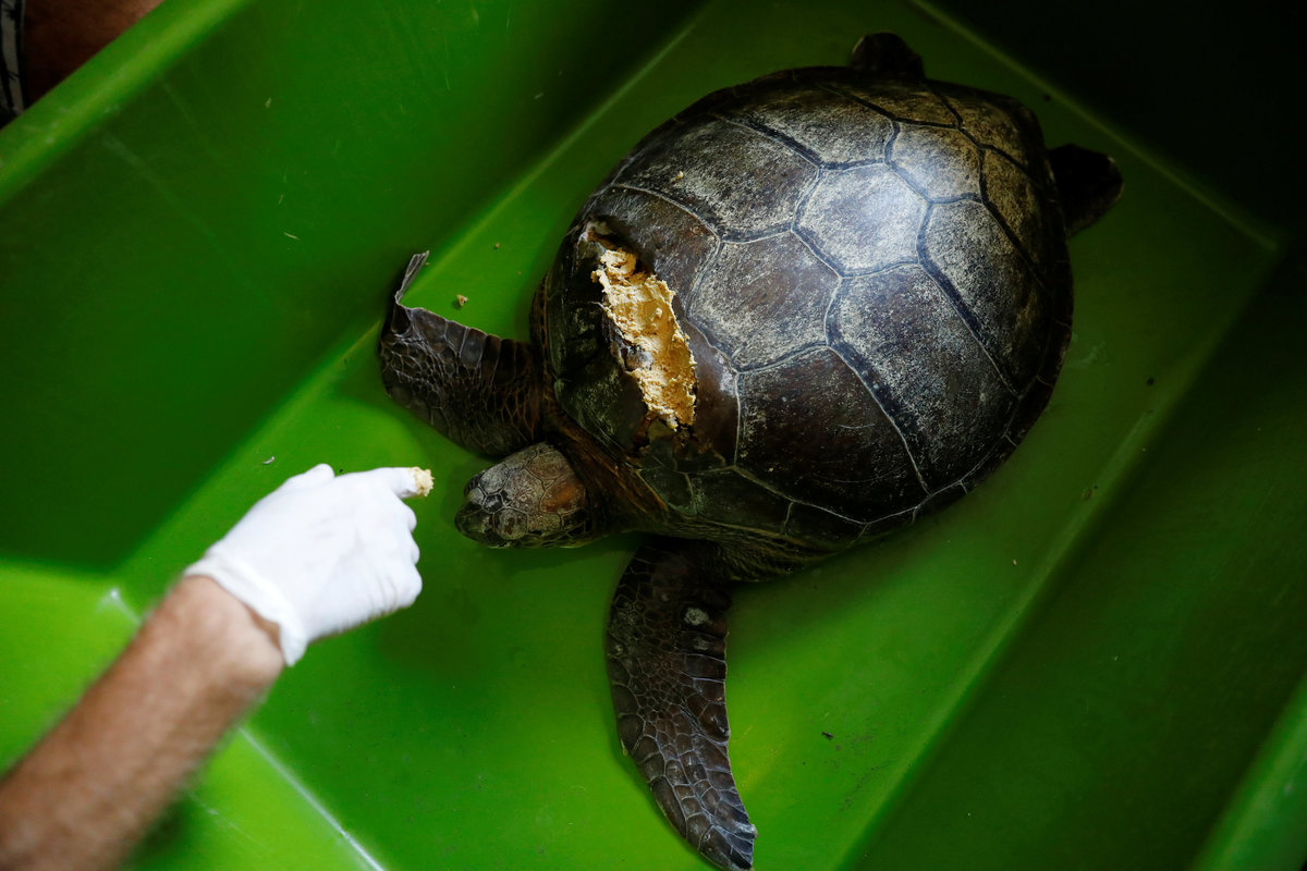An injured sea turtle is examined by Sea Turtle Rescue Center (DEKAMER) officials upon her arrival to the centre at Iztuzu Beach near Dalyan in Mugla province, Turkey, July 18, 2018. REUTERS/Umit Bektas