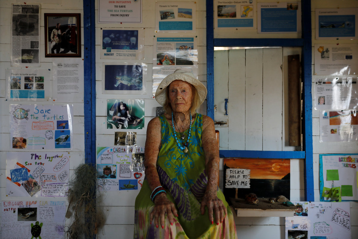 June Haimoff, known as Captain June, poses for a photo in her hut at Iztuzu Beach near Dalyan in Mugla province, Turkey, August 1, 2018. REUTERS/Umit Bektas