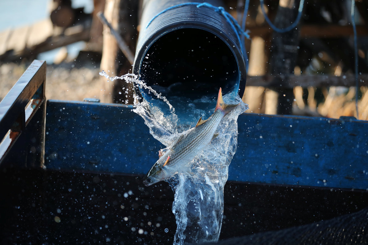A fish is loaded into a tank from a fishgarth via a pipe on the Dalyan River near Dalyan in Mugla province, Turkey, August 2, 2018. REUTERS/Umit Bektas