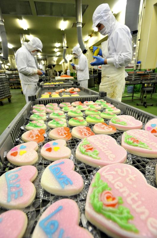 Heart-shaped kamaboko fish cakes are seen at a factory of the Umekama company in Toyama. The fish cakes are to be shipped for Valentine's Day on Feb. 14. The company began selling the seasonal product about 30 years ago, utilizing the decorative skills of locals to appeal to people who do not like sweets. The company will distribute 1,600 Valentine's kamaboko in 17 different styles to department stores and other shops in Toyama Prefecture.