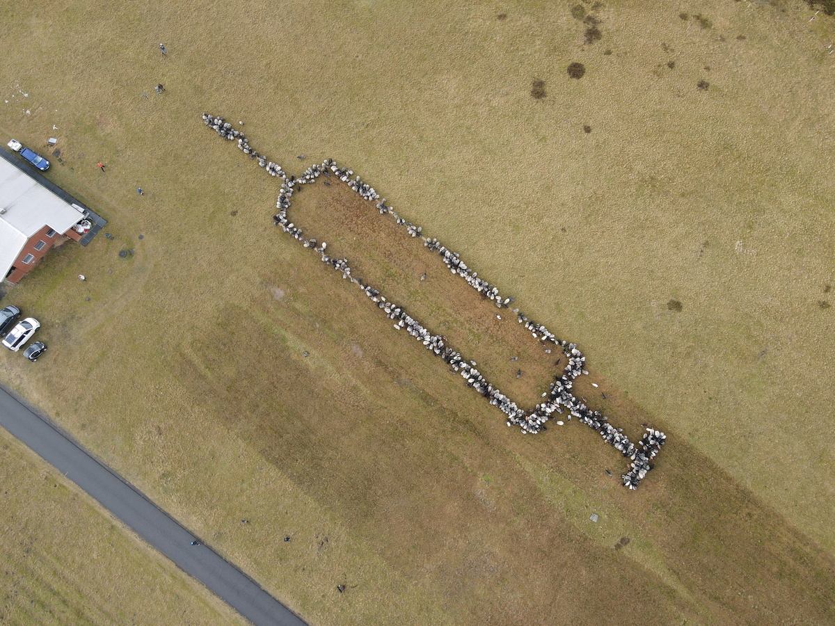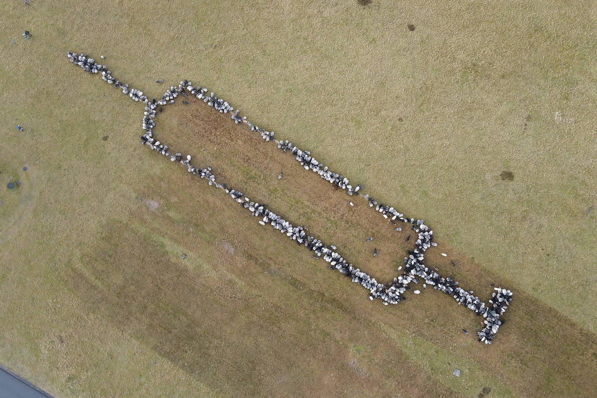 The animals, which belong to shepherd Steffen Schmidt and his wife, followed pieces of bread spread on the ground to form the 100 metre long syringe shape as they were filmed by drone.
