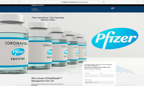 The adverts emailed to potential victims falsely claim that US bank Citigroup will invest their money in drug company Pfizer, which manufactures one of the three coronavirus vaccines approved for use in the UK.