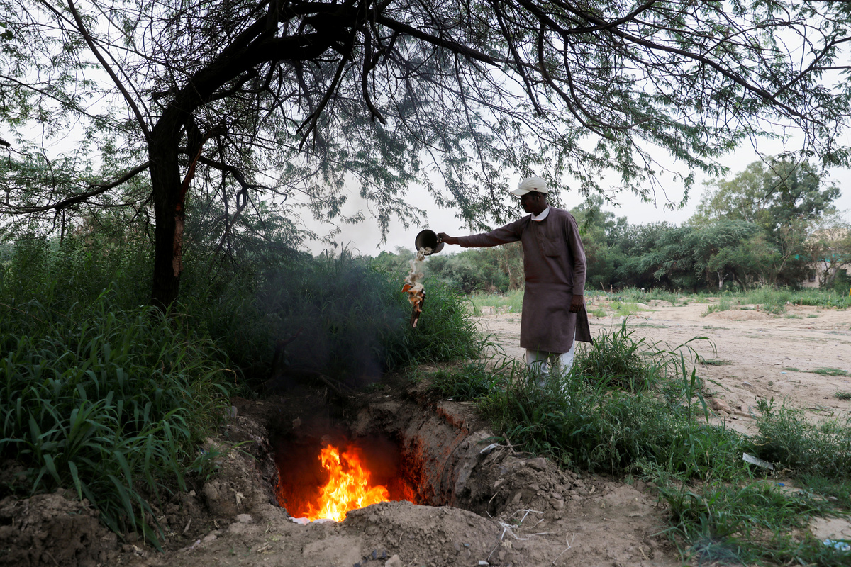 A man burns discarded personal protective equipment (PPE) suits and gloves that were left by people at a graveyard, during the coronavirus disease (COVID-19) outbreak, in New Delhi, India, July 13, 2020. REUTERS/Adnan Abidi