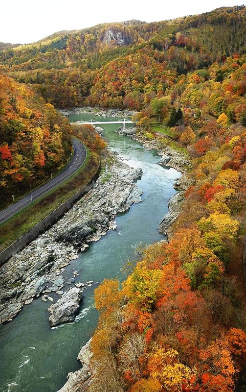 ASAHIKAWA, Hokkaido -- Kamuikotan is an area where the Ishikarigawa river flows through a steep gorge. Famous for its colorful autumn leaves, it is a sacred place for the Ainu people. In the Ainu language, "kamui" means deity and "kotan" means abode.