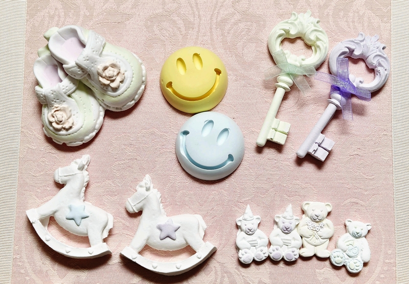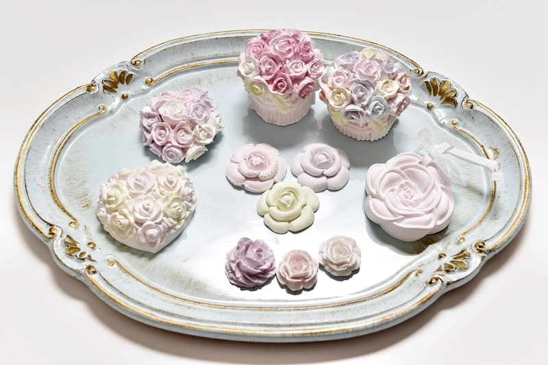 At her workshop, Yoshizawa showed scented stones in the shape of macarons, stacked cakes and cupcakes. Stacking these stones can create quite an effect. For expecting or new mothers, she also has little booties and rocking horses available. There are also elegant flowers that look particularly refined on a silver platter.