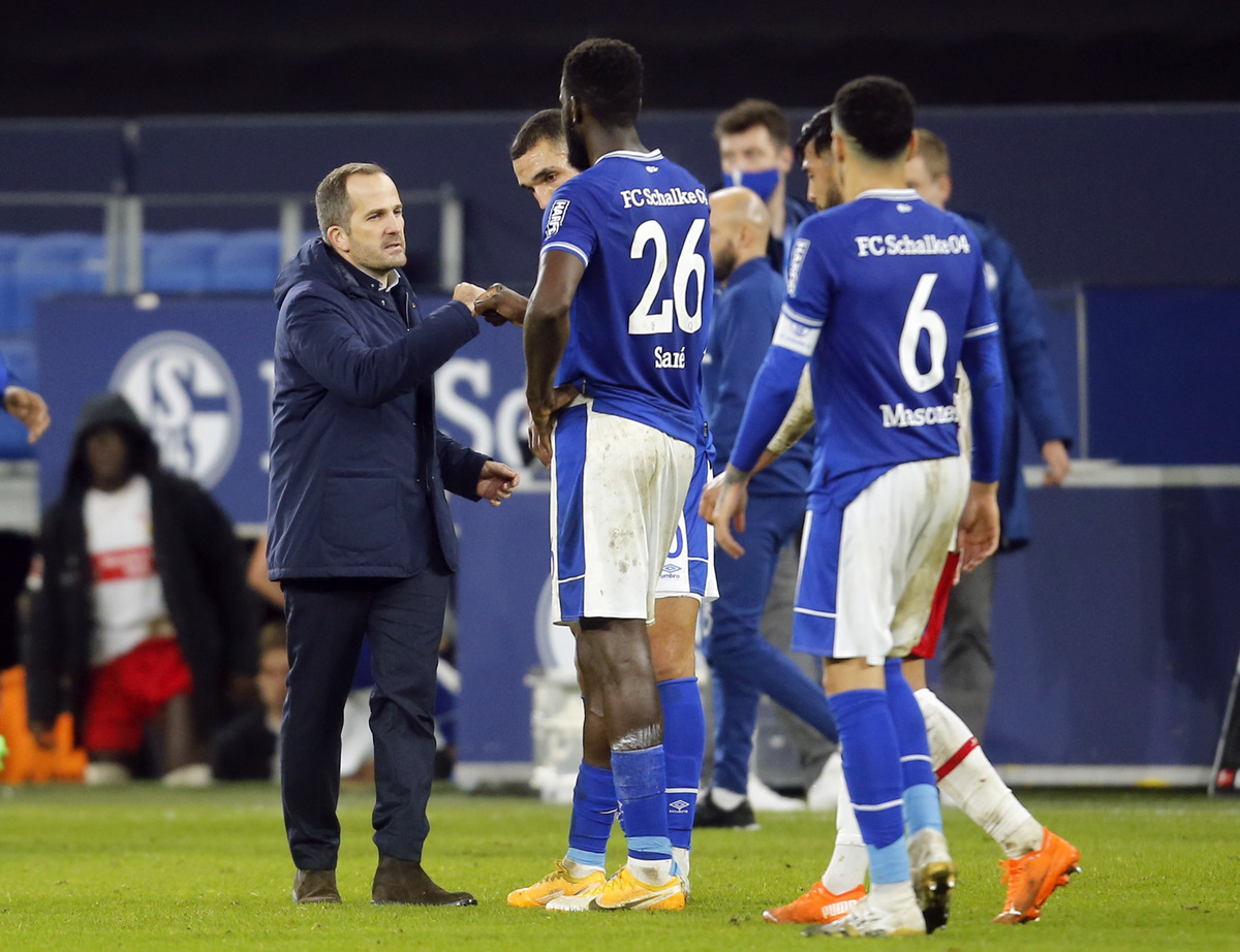 Soccer Football - Bundesliga - Schalke 04 v VfB Stuttgart - Veltins-Arena, Gelsenkirchen, Germany - October 30, 2020 Schalke 04 coach Manuel Baum with players after the match REUTERS/Leon Kuegeler