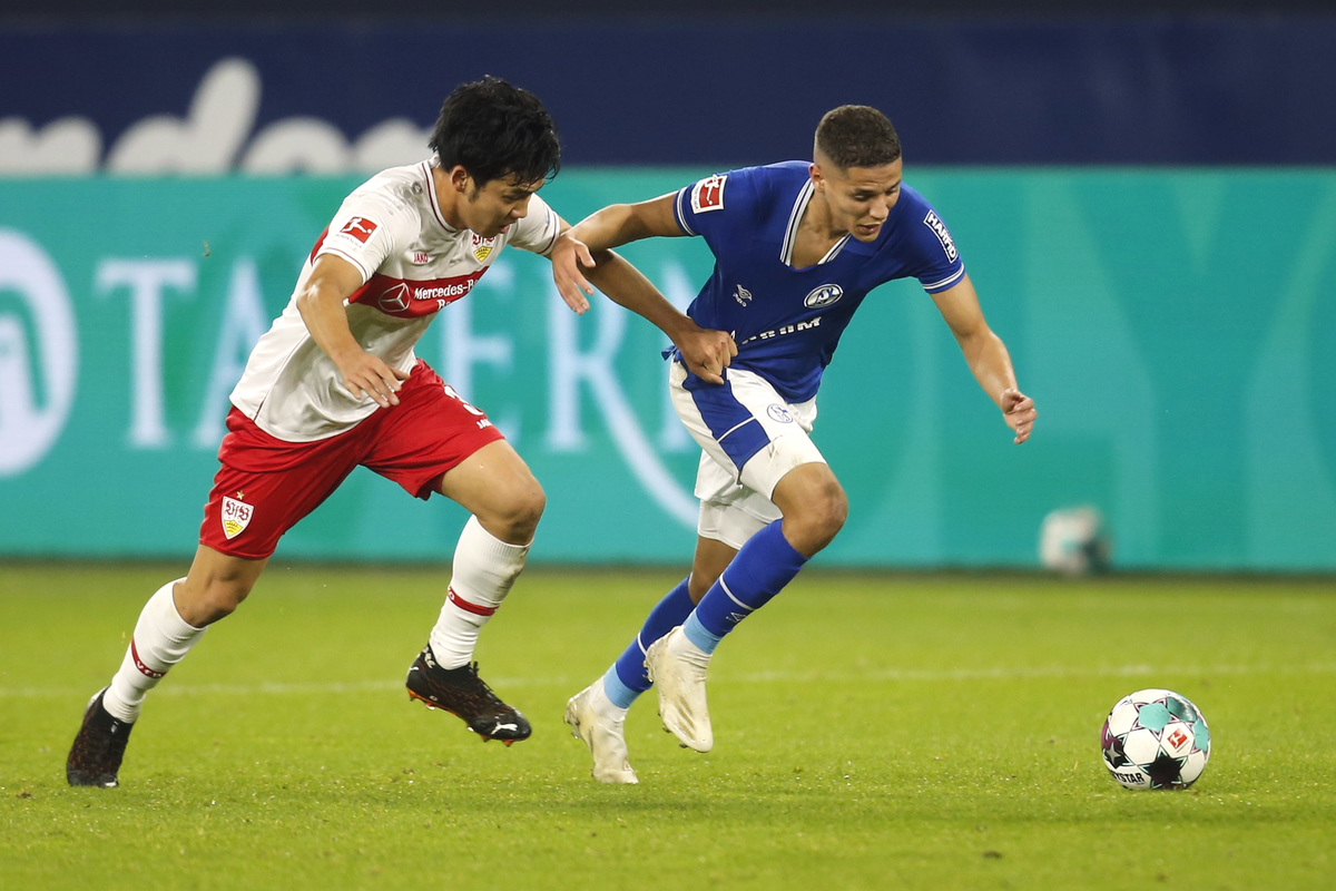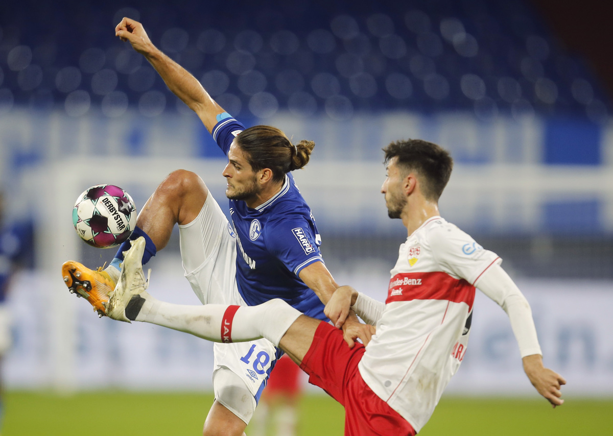 Soccer Football - Bundesliga - Schalke 04 v VfB Stuttgart - Veltins-Arena, Gelsenkirchen, Germany - October 30, 2020 Schalke 04's Goncalo Paciencia in action with VfB Stuttgart's Atakan Karazor REUTERS/Leon Kuegeler Soccer Football - Bundesliga - Schalke 04 v VfB Stuttgart - Veltins-Arena, Gelsenkirchen, Germany - October 30, 2020 VfB Stuttgart's Wataru Endo in action with Schalke 04's Amine Harit REUTERS/Leon Kuegeler