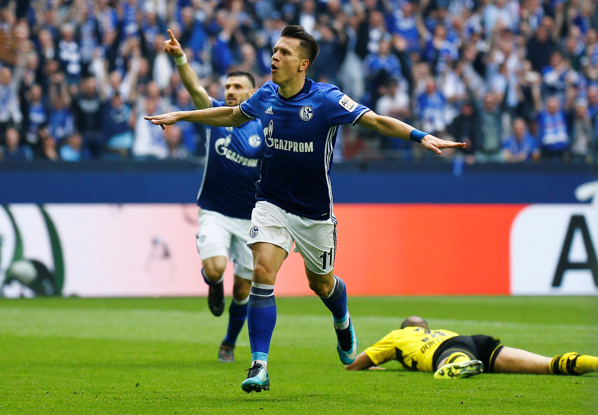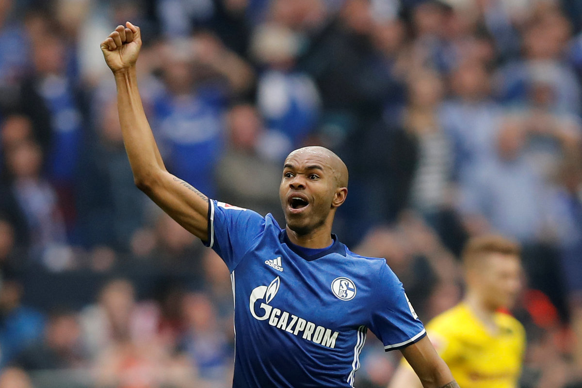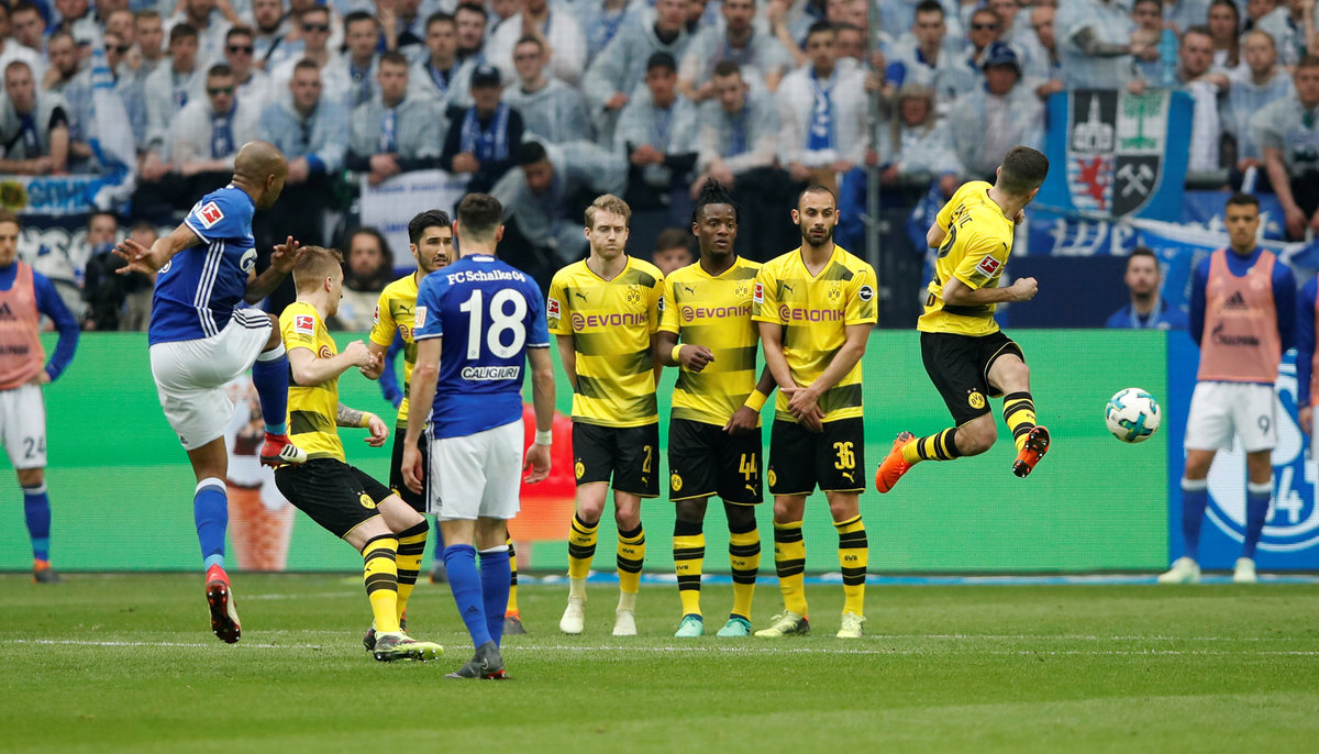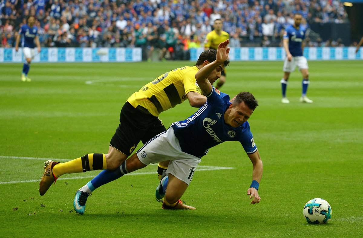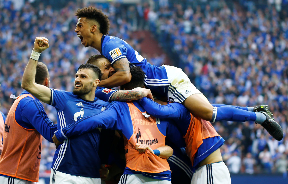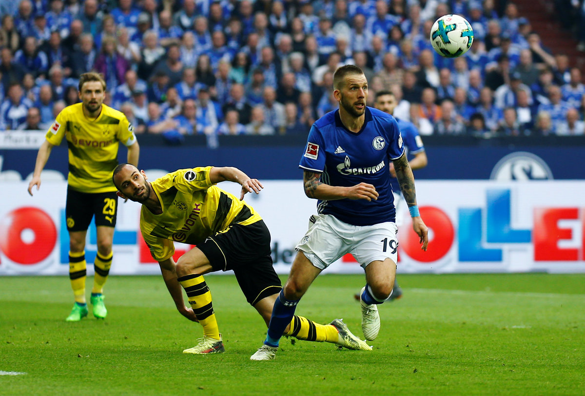 Soccer Football - Bundesliga - Schalke 04 vs Borussia Dortmund - Veltins-Arena, Gelsenkirchen, Germany - April 15, 2018 Schalke's Yevhen Konoplyanka celebrates scoring their first goal REUTERS/Leon Kuegeler Soccer Football - Bundesliga - Schalke 04 vs Borussia Dortmund - Veltins-Arena, Gelsenkirchen, Germany - April 15, 2018 Schalke's Yevhen Konoplyanka in action with Borussia Dortmund's Lukasz Piszczek REUTERS/Wolfgang Rattay Soccer Football - Bundesliga - Schalke 04 vs Borussia Dortmund - Veltins-Arena, Gelsenkirchen, Germany - April 15, 2018 Borussia Dortmund's Andre Schurrle in action with Schalke's Benjamin Stambouli REUTERS/Wolfgang Rattay Soccer Football - Bundesliga - Schalke 04 vs Borussia Dortmund - Veltins-Arena, Gelsenkirchen, Germany - April 15, 2018 Schalke's Naldo scores their second goal REUTERS/Wolfgang Rattay Soccer Football - Bundesliga - Schalke 04 vs Borussia Dortmund - Veltins-Arena, Gelsenkirchen, Germany - April 15, 2018 Schalke's Naldo celebrates scoring their second goal REUTERS/Wolfgang Rattay