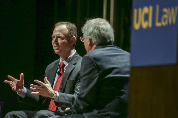 "Now if you look at this as just a one-off intervention, you might be inclined to dismiss the greater significance of it, or if you listen to the president, you might be inclined to dismiss this as simply efforts to re-litigate a lost election," Schiff told several hundred people at the University of California, Irvine, where he spoke about the Russia investigation for nearly a half hour before sitting down with UC Irvine School of Law founding dean Erwin Chemerinsky for an hourlong question-and-answer session. "But the significance is really far greater. Quite separate and apart from the desire of the Russians to help Donald Trump and hurt Hillary Clinton was a more fundamental objective, and that was really to tear down at our democracy."