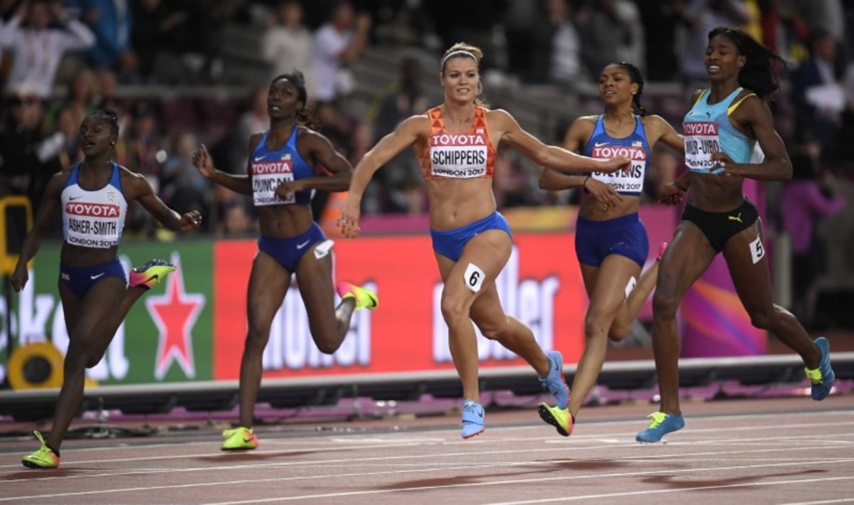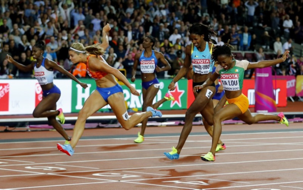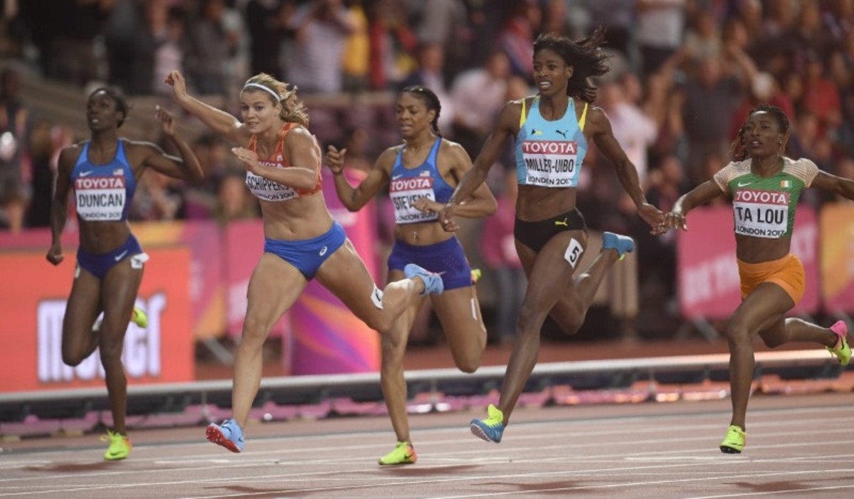 Athletics - World Athletics Championships – women's 200 metres final – London Stadium, London, Britain – August 11, 2017 – Dafne Schippers of the Netherlands competes. REUTERS/Dylan MartinezAthletics - World Athletics Championships - women's 200 metres final – London Stadium, London, Britain - August 11, 2017 - Dafne Schippers of the Netherlands, Shaunae Miller-Uibo of Bahamas and Marie-Josee Ta Lou of Ivory Coast compete. REUTERS/Toby MelvilleAthletics - World Athletics Championships - Women's 200 Metres Final - London Stadium, London, Britain – August 11, 2017. Dafne Schippers of the Netherlands wins the final. REUTERS/Toby Melville