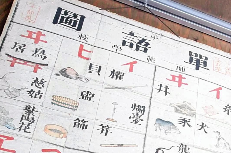 Soon after the start of Japan's modern school education, sheets with pictures called "tango-zu" were used in elementary school Japanese-language classes. On the sheets, words indicating flutes and houses are printed with colorful pictures.