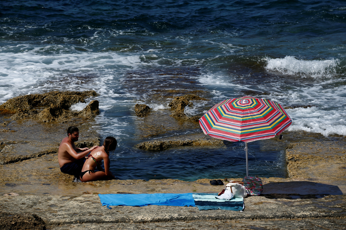 People try to cool off on a rocky beach as a heatwave hits Europe, in Sliema, Malta, June 26, 2019. REUTERS/Darrin Zammit Lupi