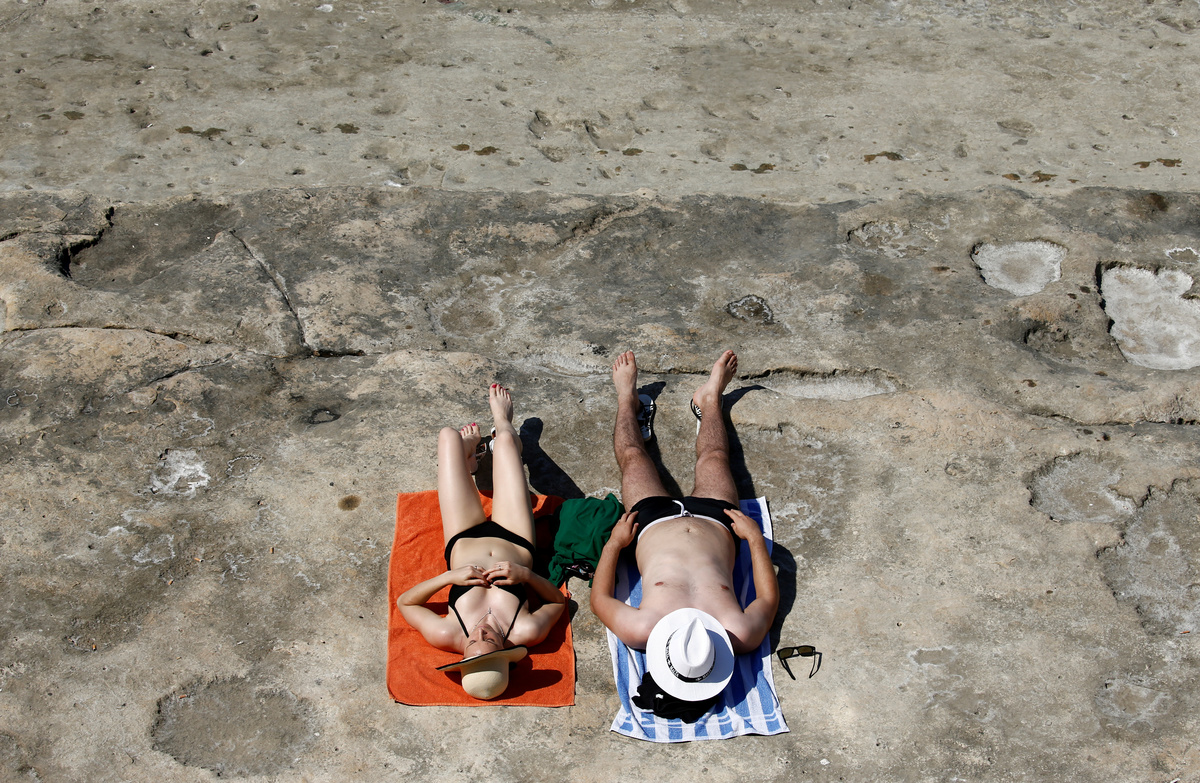 People sunbathe on a rocky beach as a heatwave hits Europe, in Sliema, Malta, June 26, 2019. REUTERS/Darrin Zammit Lupi