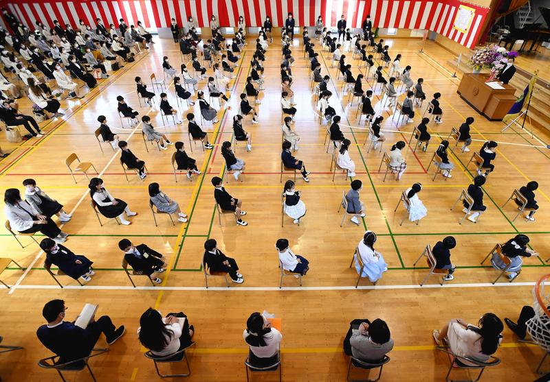 In the gymnasium of Katsushika Elementary School in Katsushika Ward, Tokyo, where 54 children newly enrolled, the students and up to two members of each entering student's family sat down with a sizeable space between them.