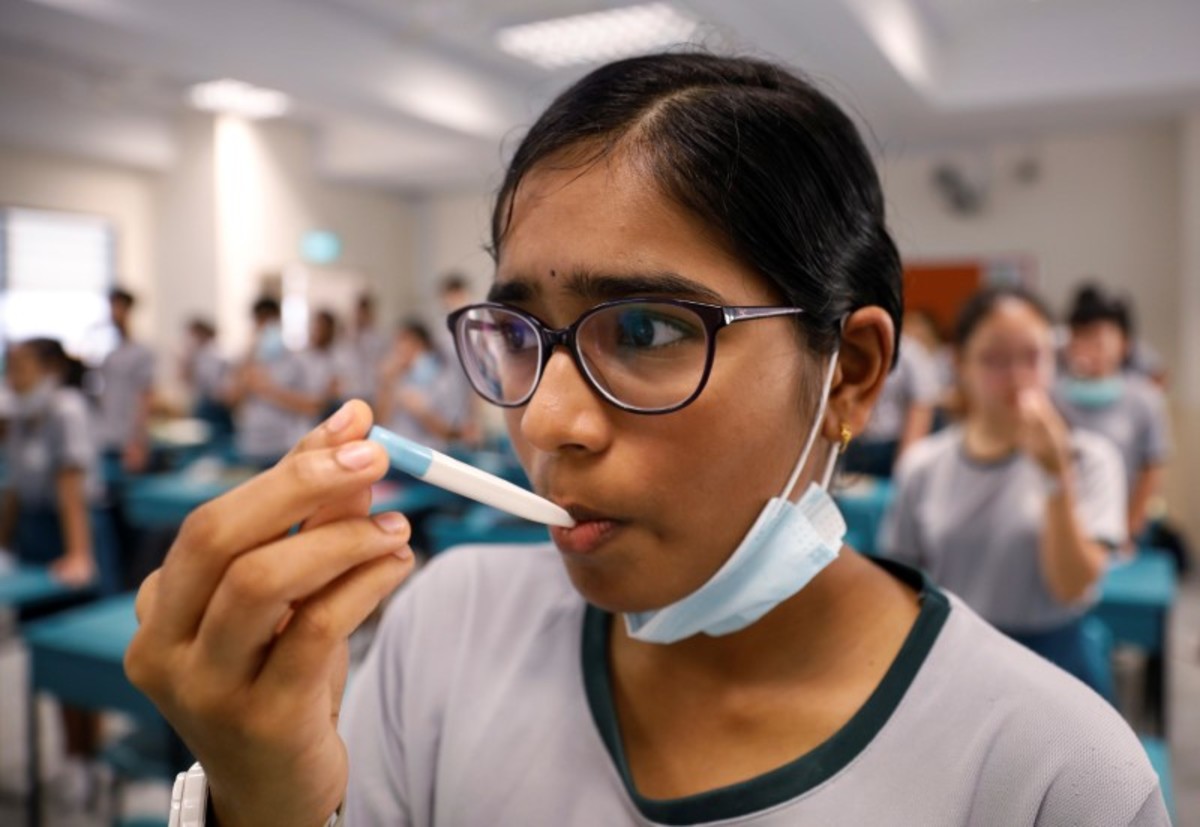 Students have their temperature checked in class at Yio Chu Kang Secondary School, as schools reopen amid the coronavirus disease (COVID-19) outbreak in Singapore June 2, 2020. REUTERS/Edgar Su