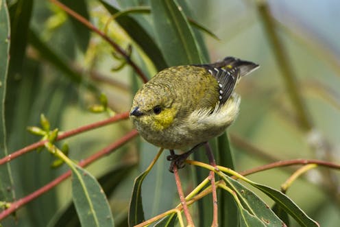 Forty-spotted pardalotes are olive-green songbirds with two rows of white dots along their wings. Deforestation has caused their local extinction across much of mainland Tasmania. The birds survive mostly on islands off the east coast in numbers that vary according to habitat quality.
