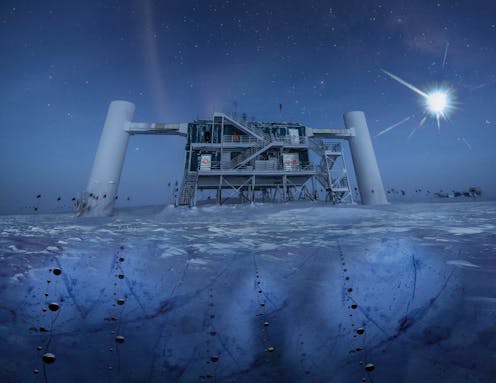Another telescope has now grown to be the largest of them all. The IceCube experiment at the South Pole is a cubic kilometre in size and uses deep arctic ice as a target for the neutrinos. Although neutrinos typically don’t interact with anything, they can produce a charged particle when they occasionally do interact with the fundamental particles that make up ice. In IceCube, this resulting particle travels through the ice and produces a trail of faint light.