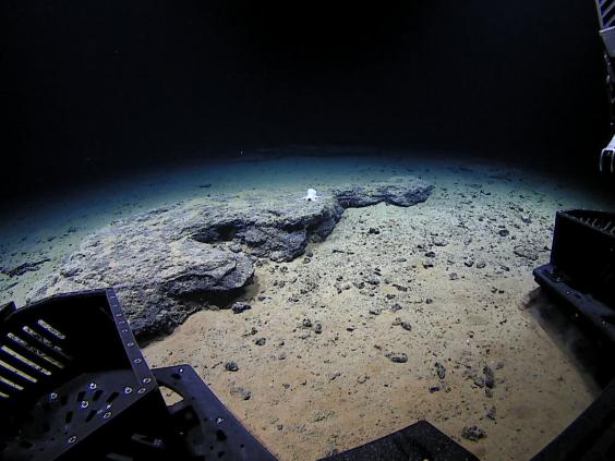 One of the researchers, Michael Vecchione, said the camera was traversing a rocky plateau when it “came across a remarkable little octopod sitting on a flat rock dusted with a light coat of sediment”.