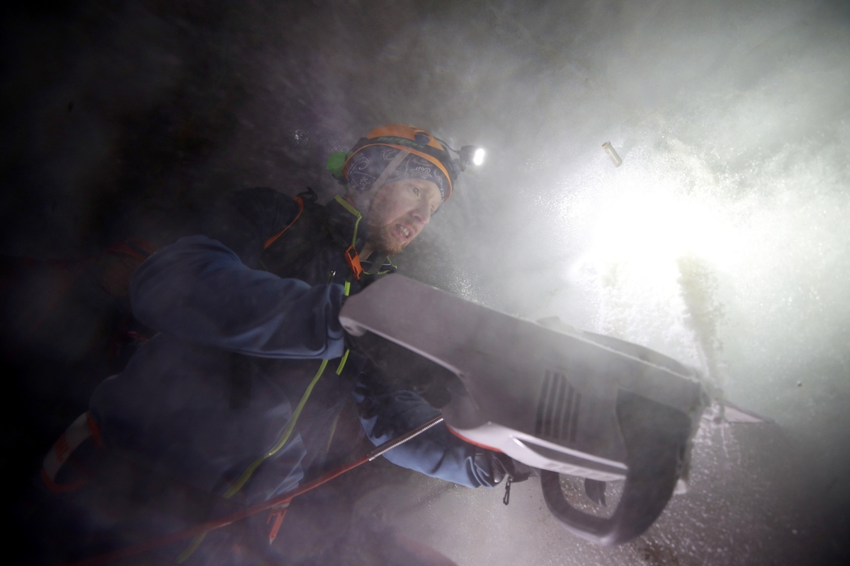 FILE PHOTO: Environmental physicist Pascal Bohleber from the Austrian Institute for Interdisciplinary Mountain Research, uses a chainsaw to cut out a sample of ice inside an artificial ice tunnel of Schaufelferner glacier at Stubaier glacier ski resort near Neustift im Stubaital, Austria, October 22, 2018. REUTERS/Lisi Niesner
