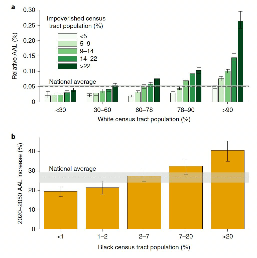 As we approach 2050, the researchers reveal a shift: poor Black Americans will have a much higher risk of flood exposure. Flood risk in areas with greater than 20 percent black residents will be double that of flood risk in communities with less than one percent Black residents.