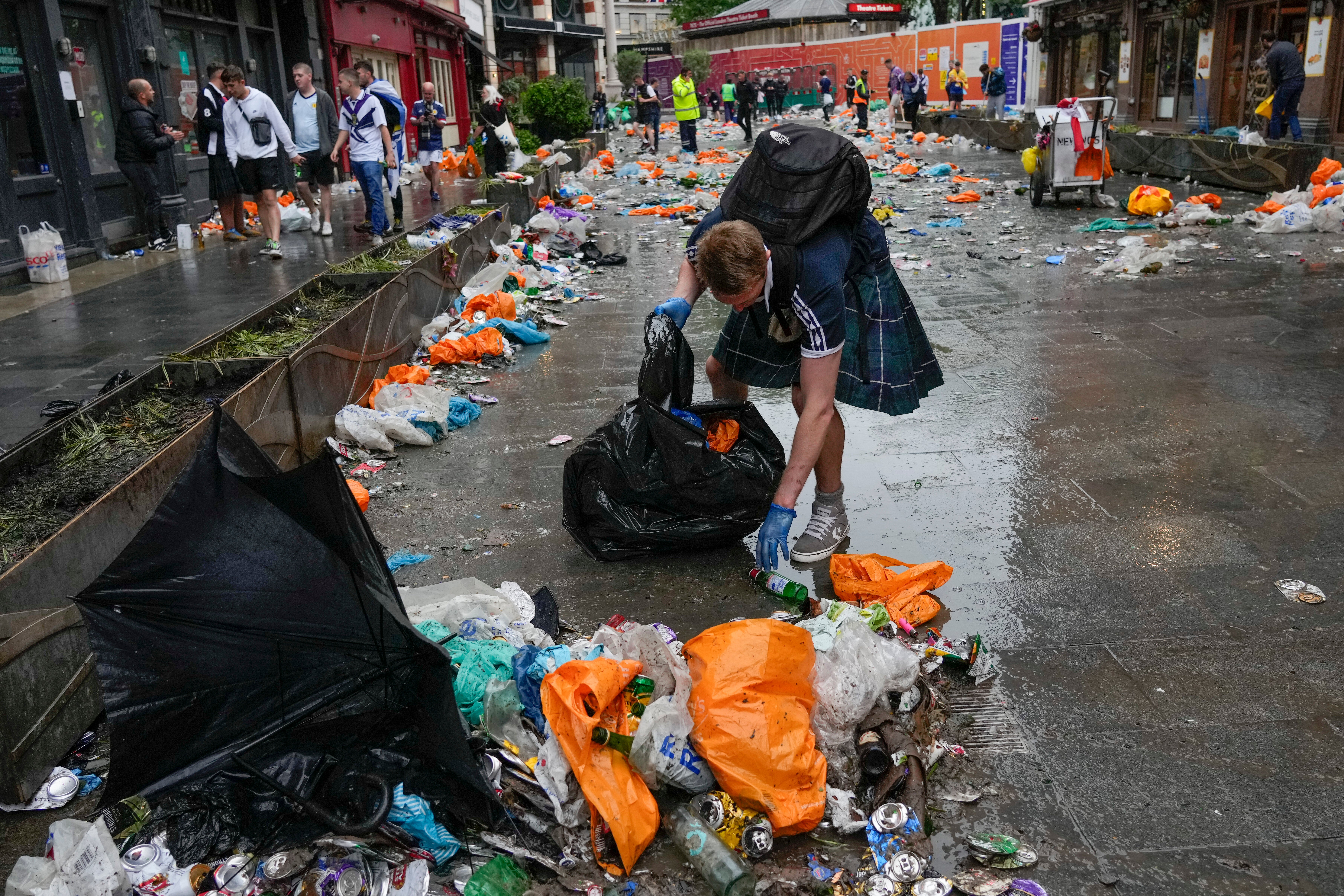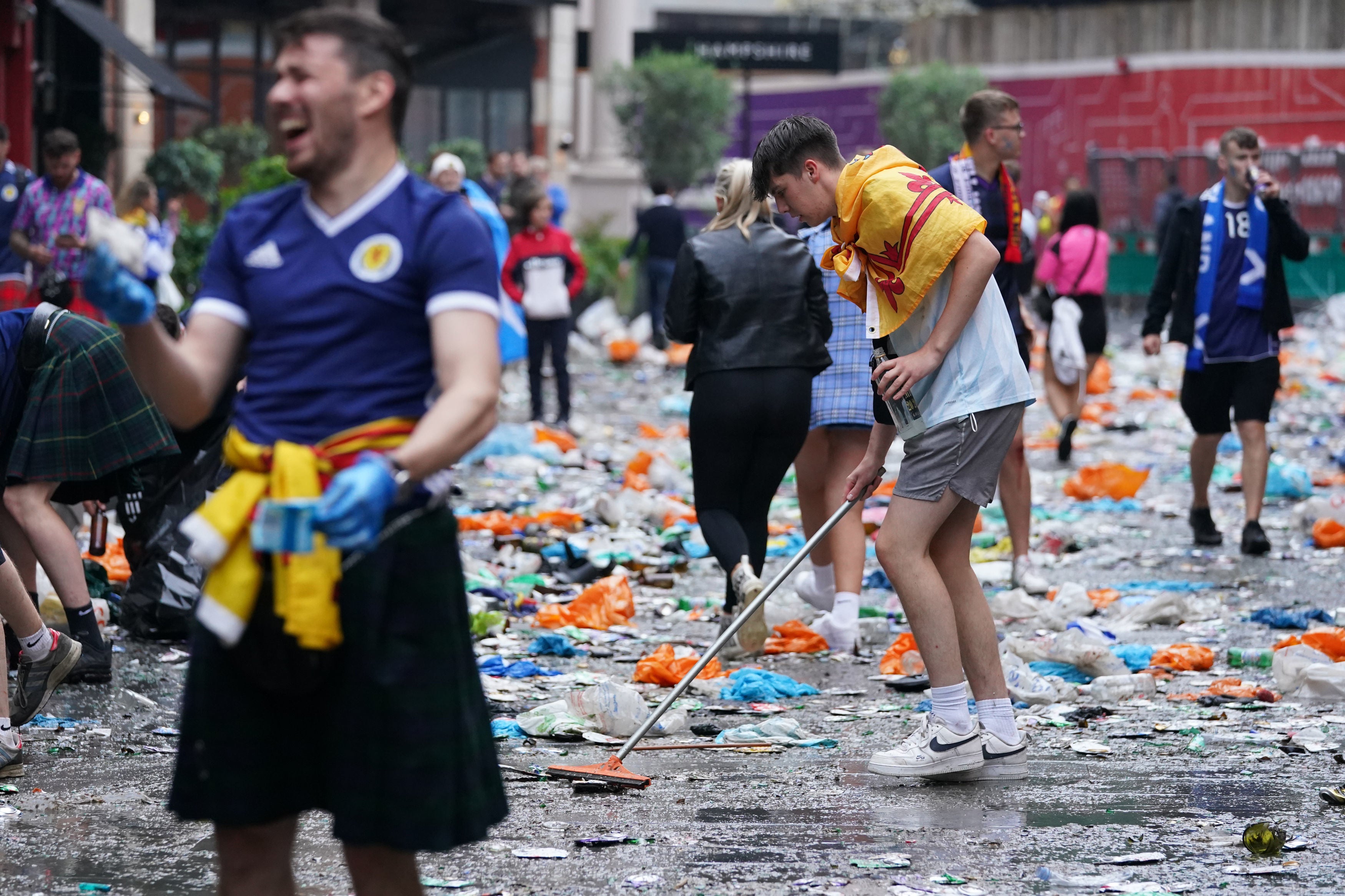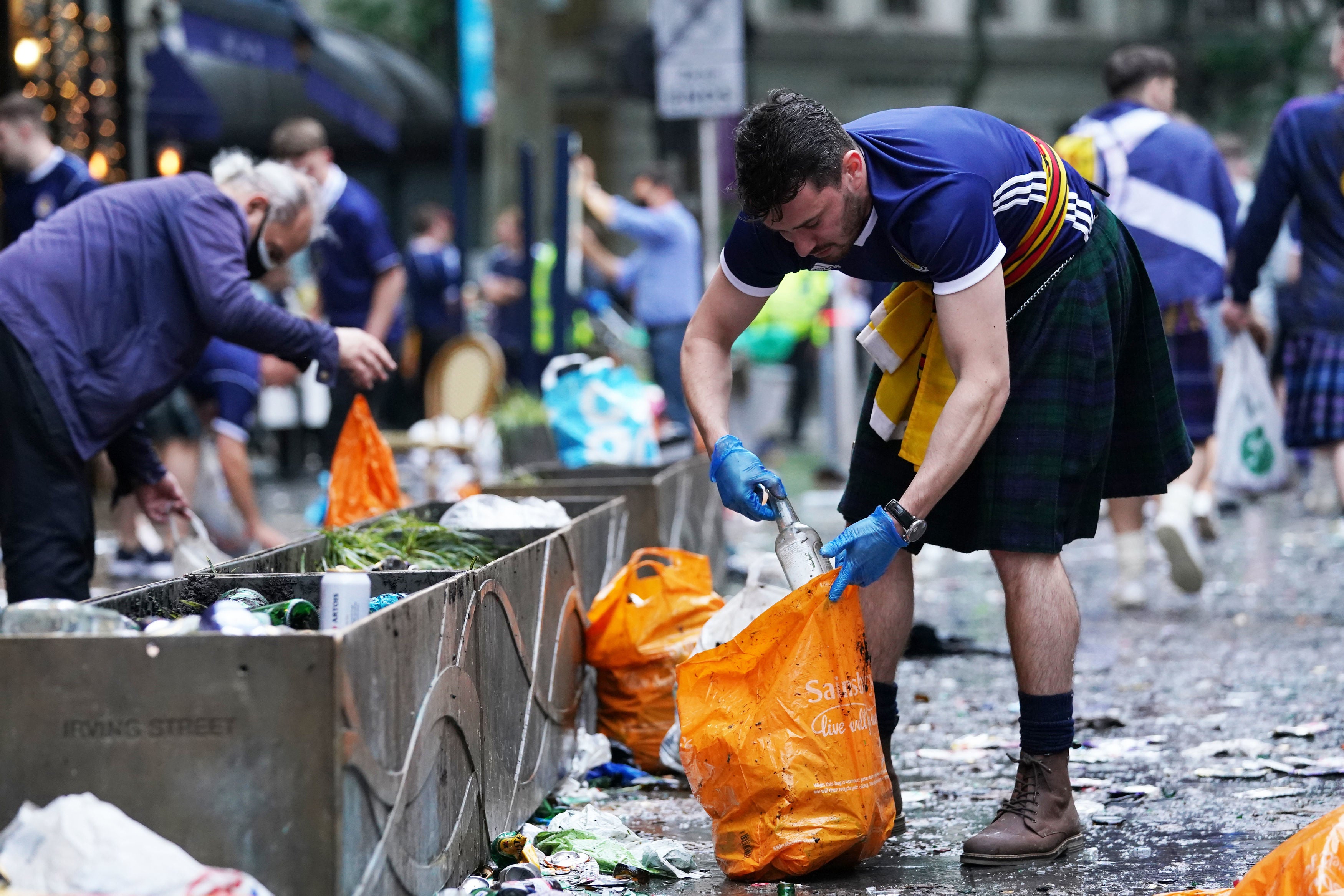 Ahead of the 8pm game, Scotland fans, wearing kilts and the country’s football shirts, were seen using brooms and rubbish bags to help clear some of the debris off the streets.
