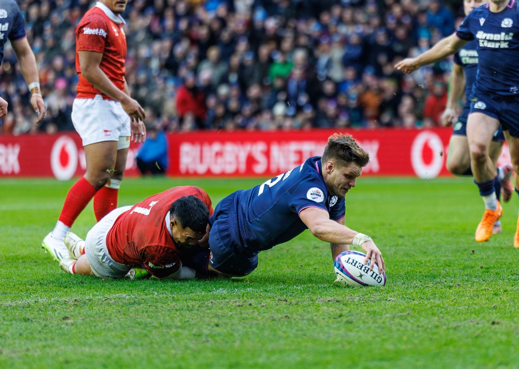 Scotland capitalised by scoring their first three tries in his absence. The first came in the 10th minute when Perpignan back-rower Ritchie, on his first appearance of the autumn, powered his way through two Tongans to open the scoring.