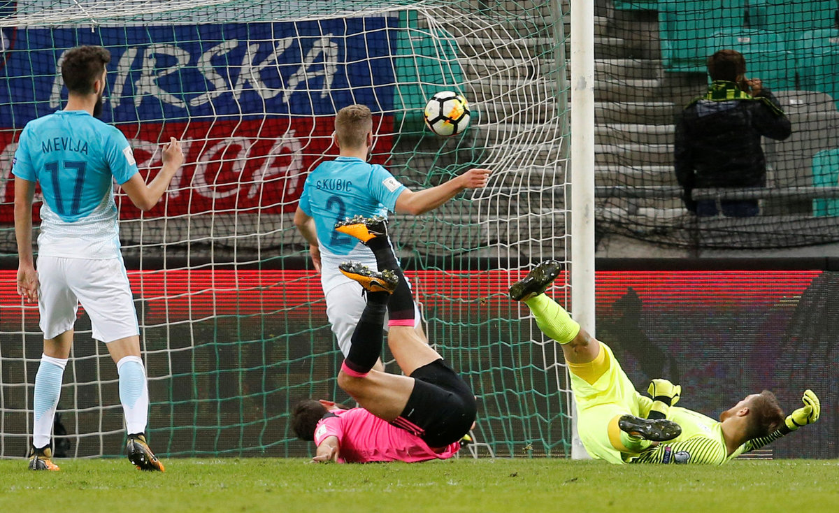 After Cesar's red card following an altercation with Christophe Berra, Snodgrass could not generate enough power to direct his header over goalkeeper Jan Oblak, who had conceded his first goals at home in the qualifying campaign.