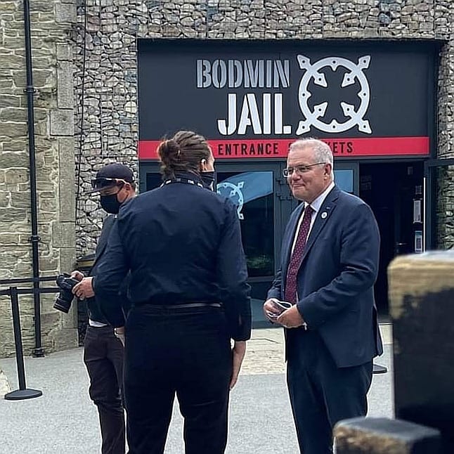 One of the places Mr Morrison visited was Bodmin Jail, which posted on its Facebook page that it had received a "surprise visitor" who had "popped in to hear about the strong Australian connections with many inmates held at the jail".