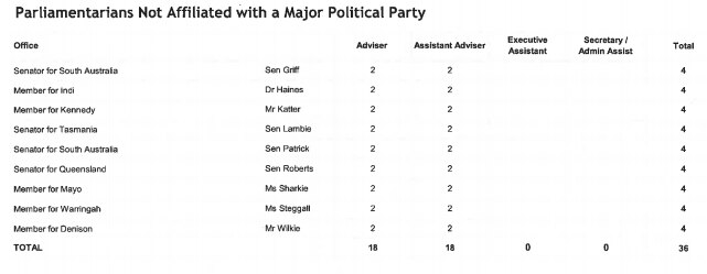 MPs and senators not affiliated with a major party can currently receive up to four additional staff.