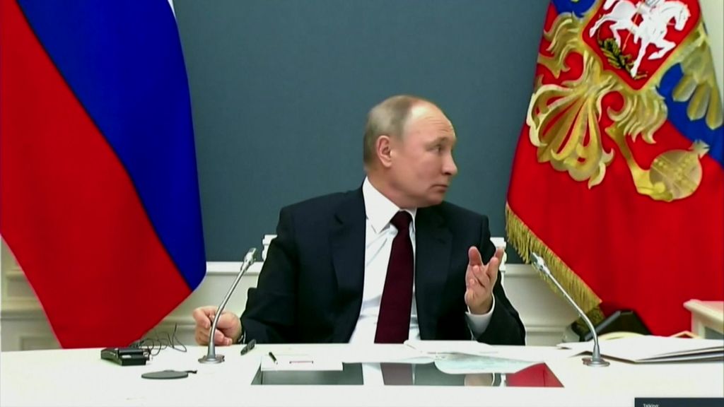For more than a minute, the Russian leader was silent on screen, staring forward and not talking except to turn his head toward aides.