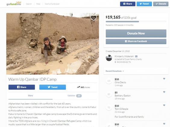 The offending link was to a Go Fund Me page raising money to buy blankets for families at the Chahari Qambar refugee camp near Kabul, where children froze to death in 2012.