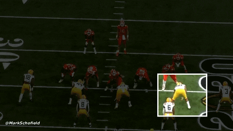 Madubuike uses a two-armed hand swipe to beat the center’s initial punch, then immediately transitions to a rip move to knife past the attempted counter from the blocker. From there he bursts into the chest of the quarterback, preventing him from stepping into this throw and perhaps completing a long TD throw. Texas A&M often used him as the sole down lineman in their “Radar” alignment, with every other defender in a two-point stance flowing freely until just before the snap. Think of how the New England Patriots employed Trey Flowers at times during the 2018 campaign.